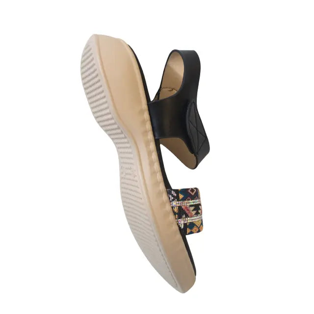 These boho chic sandals women are a perfect blend of casual comfort and artisan-inspired design. A cushioned beige sole keeps you light on your feet, while the smooth black ankle strap holds firmly without digging in. These boho sandals for women feature a thick, soft beige sole that supports your feet all day long. The front strap is crafted from woven fabric, showing off a colorful geometric pattern in earthy tones — including mustard, white, red, and navy — giving the sandals a unique handcrafted look.
